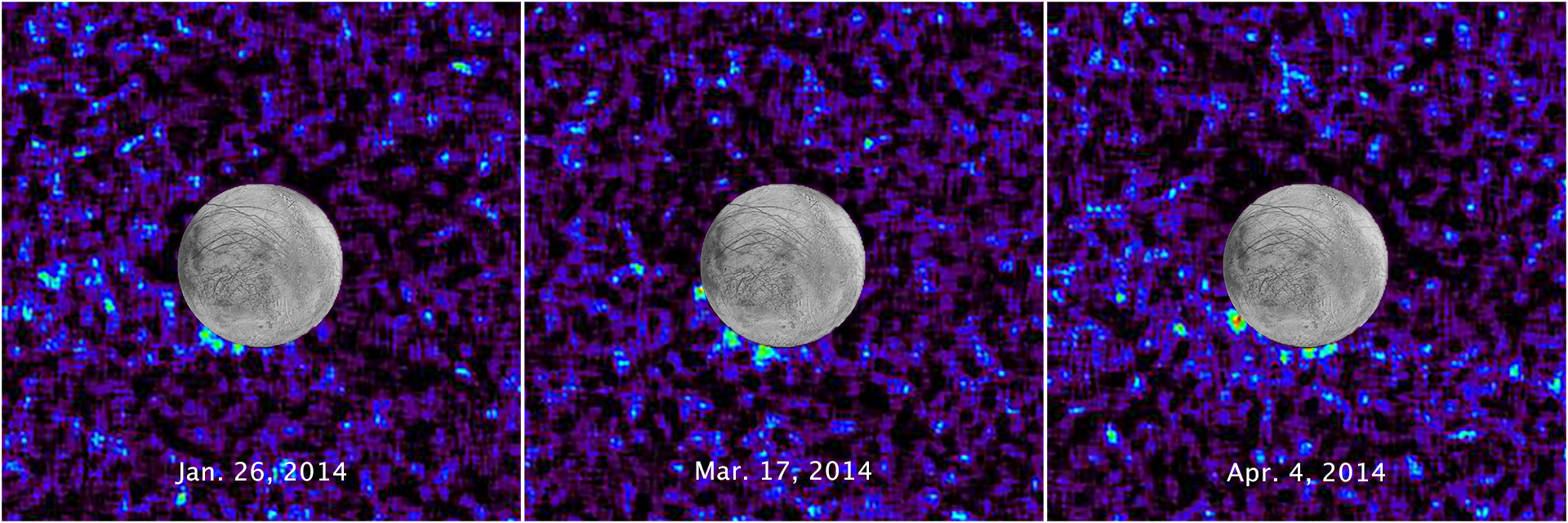O Telescópio Espacial Hubble espiou o que parecem ser nuvens de água em erupção a partir da superfície da lua Europa de Júpiter. Este satélite gelado pode abrigar um oceano de água líquida bem abaixo de sua superfície, e os cientistas pensam que o mar poderia ter os ingredientes certos para a vida. A NASA está planejando enviar uma sonda em órbita para estudar Europa na década de 2020.