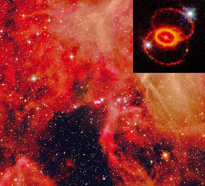 | Anéis em torno da Supernova 1987A, com a ejeção da explosão da Supernova no centro do anel inteiro |